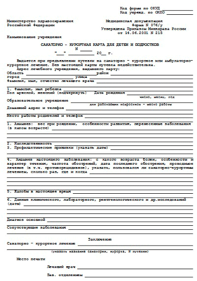 Для того, чтобы составить санаторно-курортную карту формы 076 у — 04, необходимо предоставить данные о результатах пребывания в учреждении, занимающимся амбулаторным или стационарным лечением маленьких пациентов. Также следует уточнить текущие сведения о состоянии здоровья на момент заключения справки и результаты анализов мочи и крови.