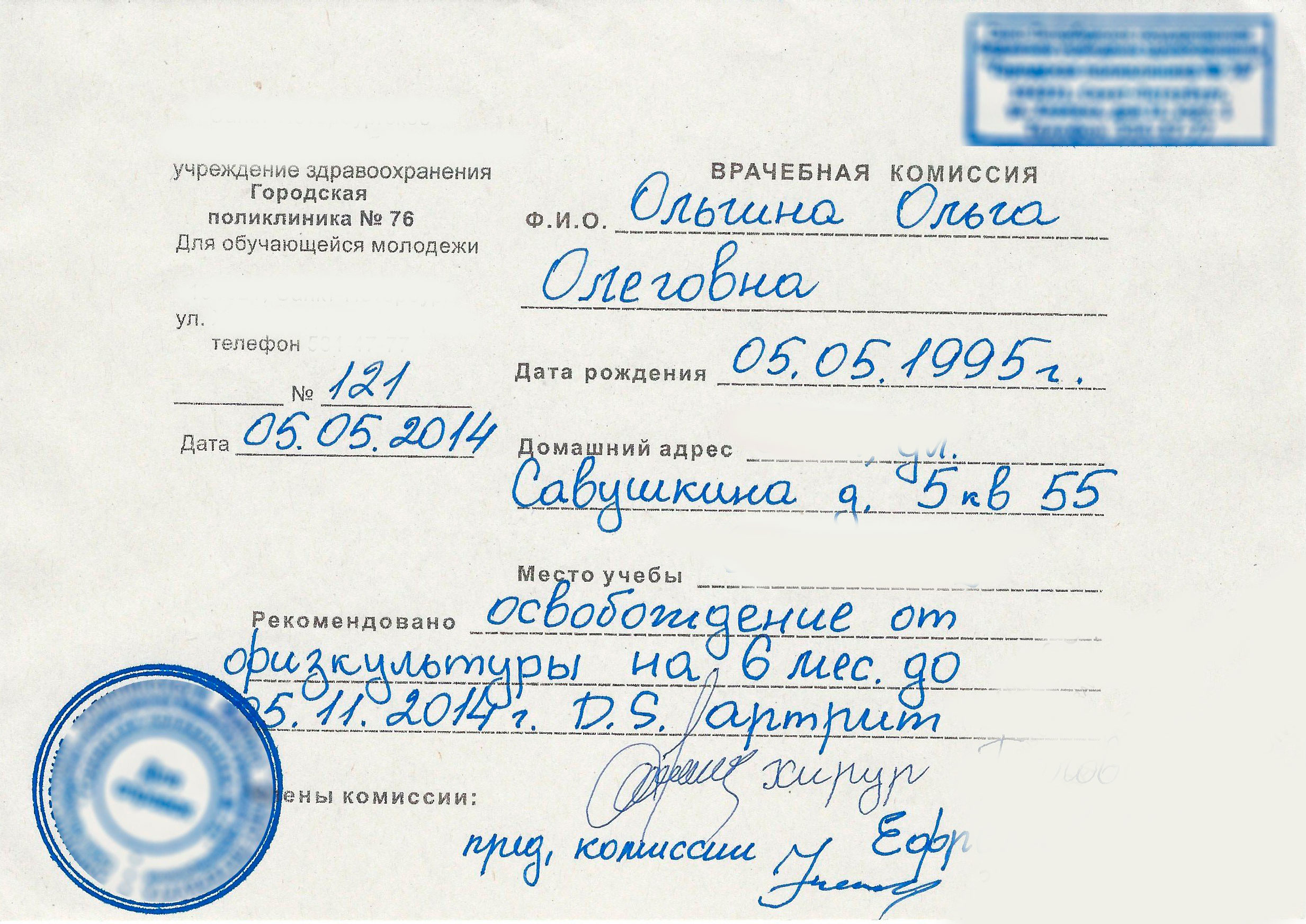 Если у вас нет желания доказывать наличие этих заболеваний у врача, вы можете Получить справку для освобождения от физкультуры. Справка дает полное или временное освобождение. Процесс оформления справки весьма сложен, поскольку сопряжен с получением и оформлением ряда других документов. Выход: купить у нас справку для освобождения от физкультуры в любой школе или любом ВУЗе Санкт-Петербурга и с любым диагнозом.